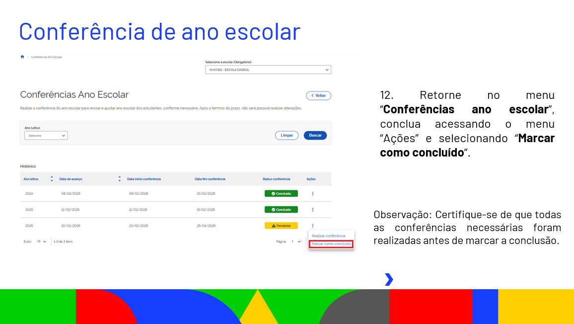 Em seguida, retorne ao menu **“Conferências ano escolar”** e finalize o processo. No menu **“Ações”**, selecione a opção **“Marcar como concluído”**.