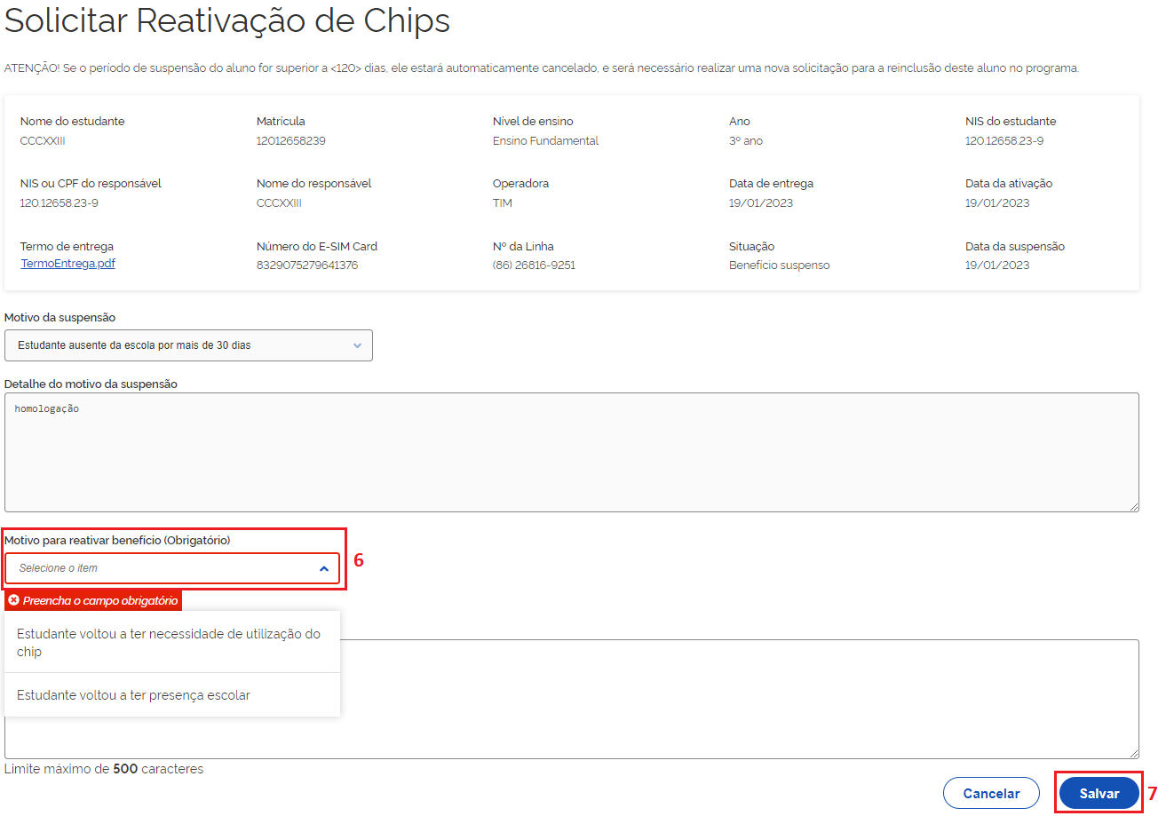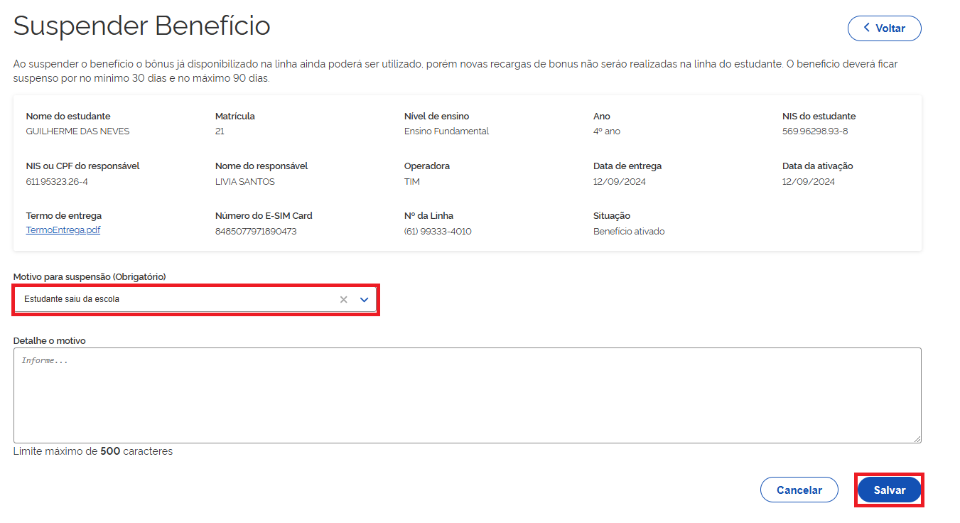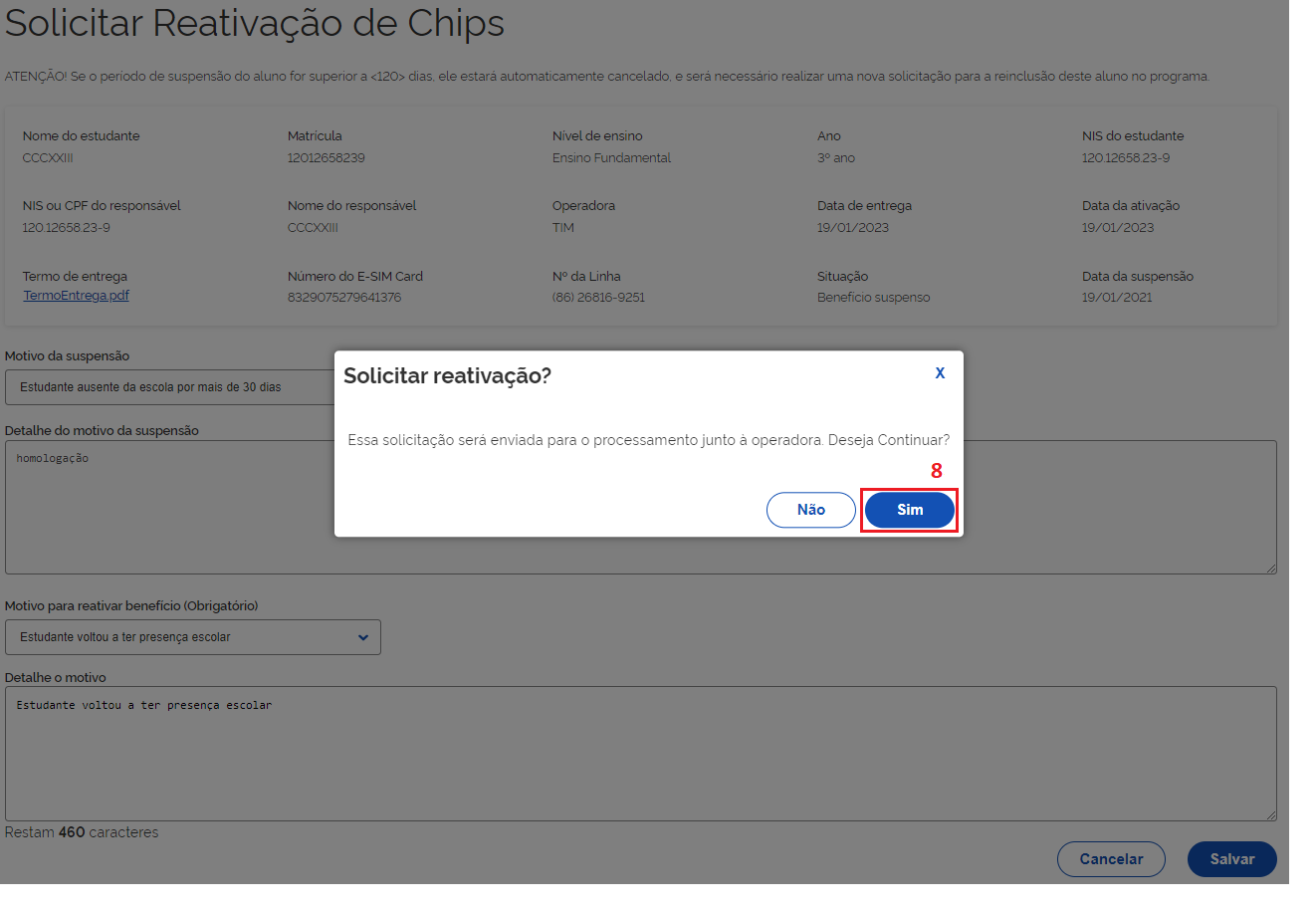 Abrirá uma nova janela , e no campo **"Motivo para reativar beneficio"**, selecione a melhor opção para reativar o chip do(a) estudante.