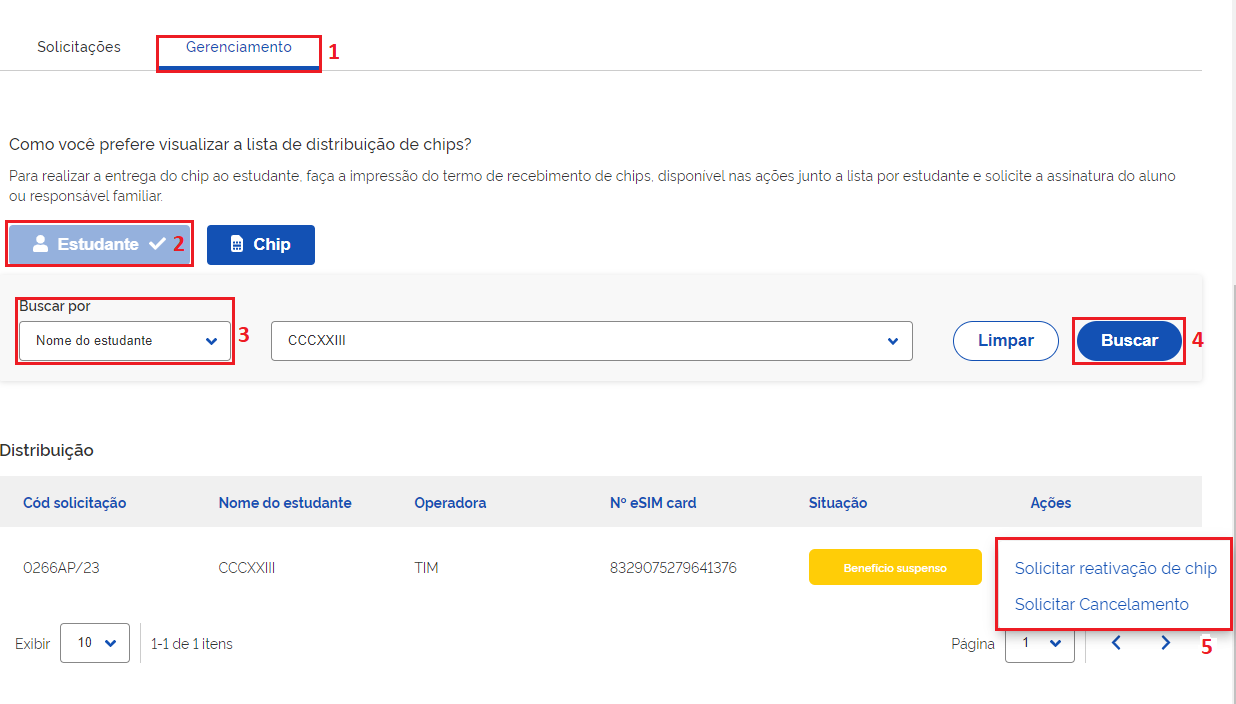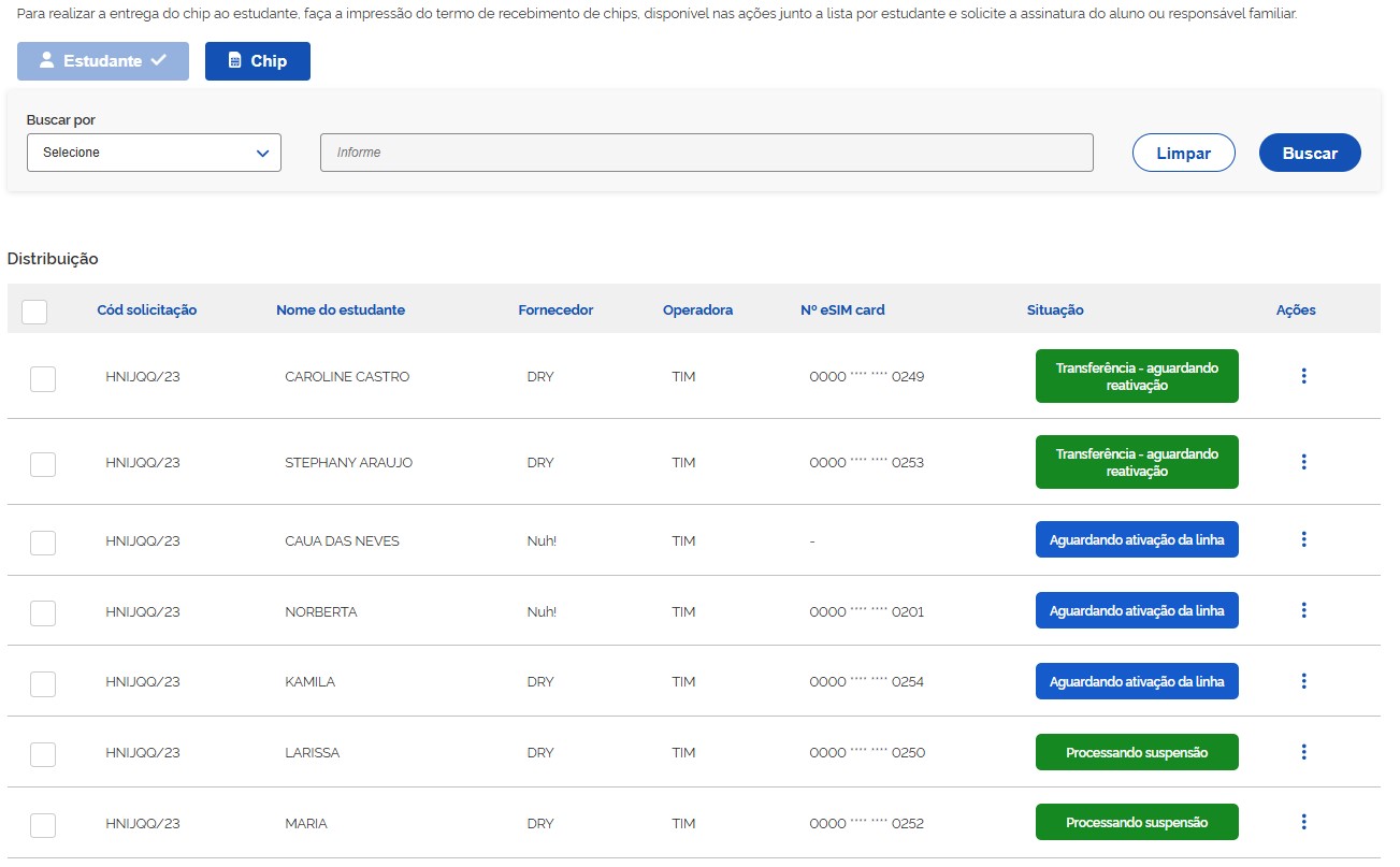Na coluna **"Ações"** clique nos 3(três) pontos e selecione a opção **"Solicitar reativação do chip"**.
