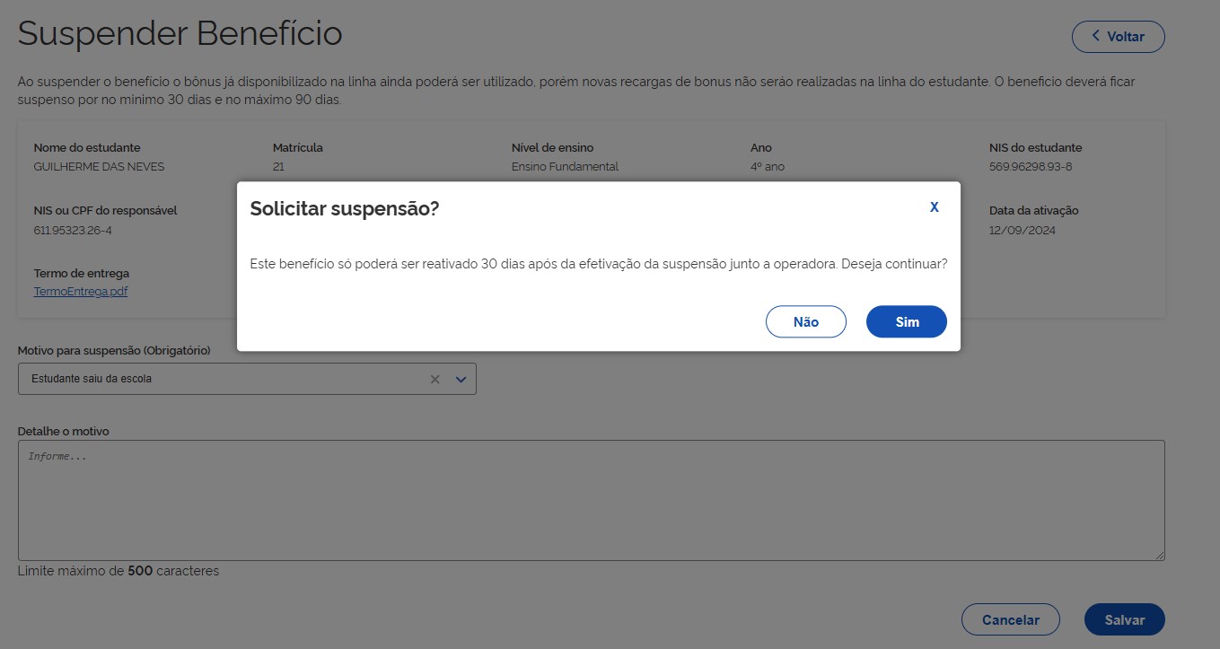 Ao suspender o benefício o bônus já disponibilizado na linha ainda poderá ser utilizado, porém novas recargas de bônus não serão realizadas na linha do estudante. O beneficio deverá ficar suspenso por no mínimo 30 dias e no máximo 90 dias.
