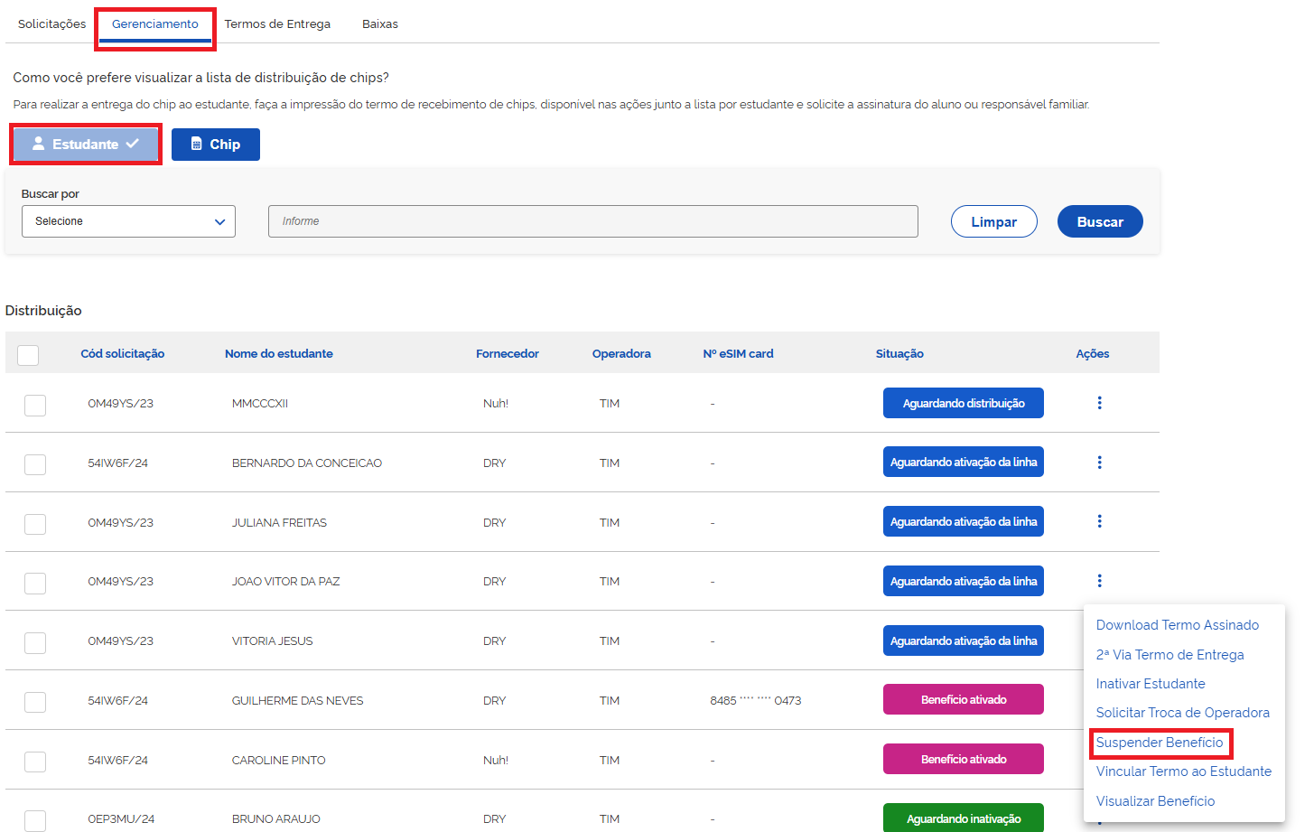 Na coluna de **"Ações"**, clique nos 3 (três) pontos e selecione a opção **"Suspender Benefício"**.